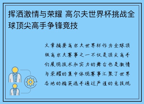 挥洒激情与荣耀 高尔夫世界杯挑战全球顶尖高手争锋竞技