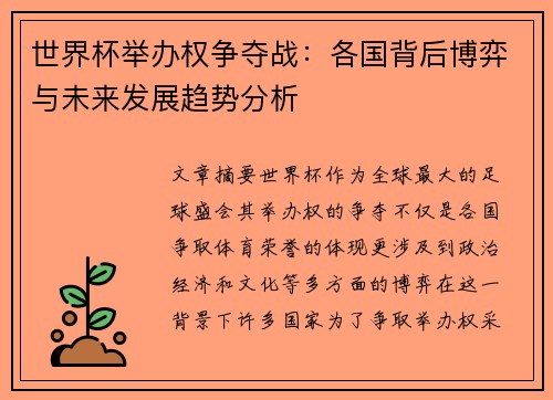 世界杯举办权争夺战:各国背后博弈与未来发展趋势分析